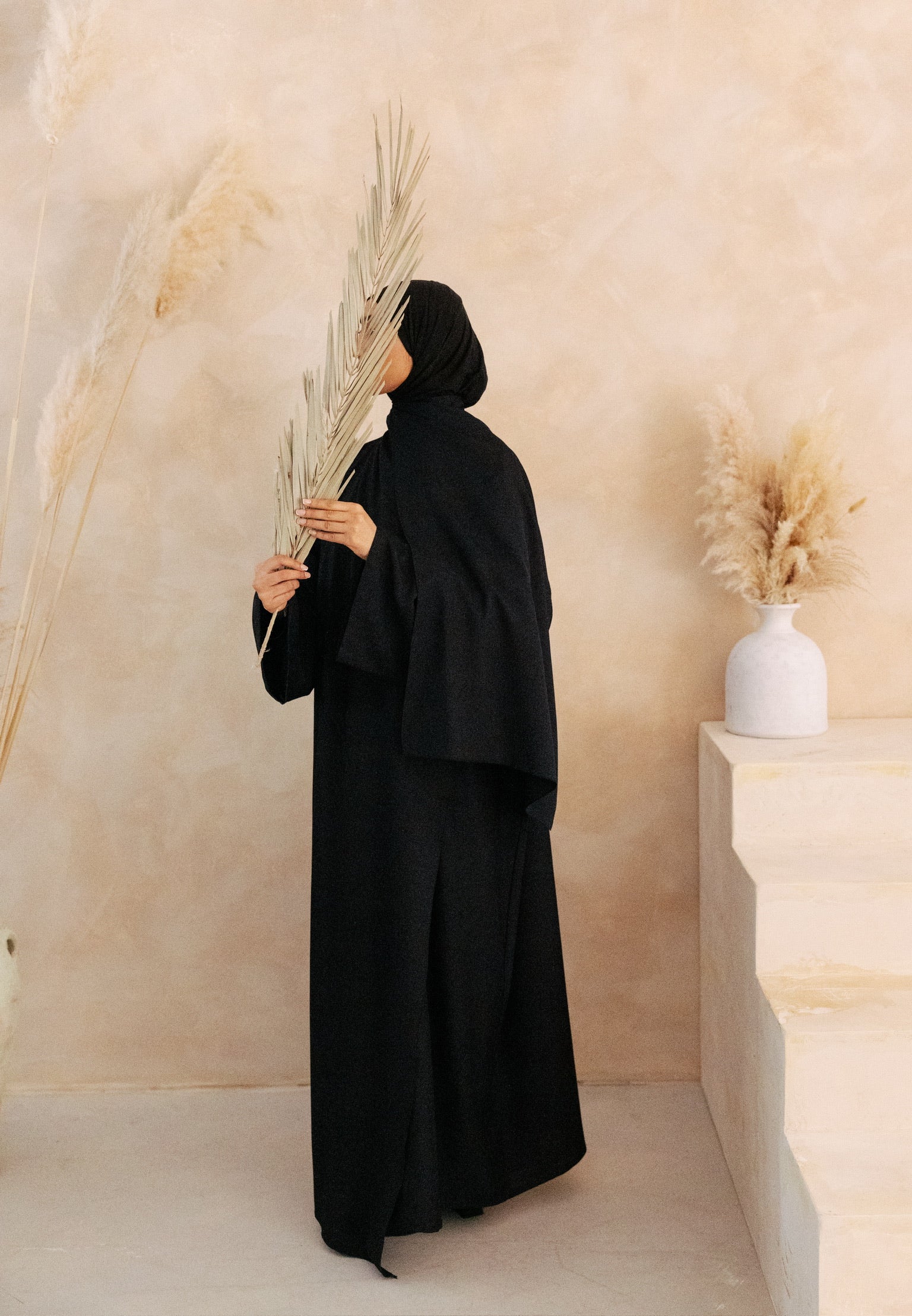 Command attention with timeless grace. Crafted from fluid, premium fabric, this black abaya is the epitome of understated luxury — where elegance, modesty, and presence become one.